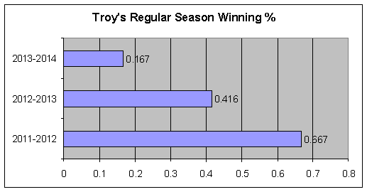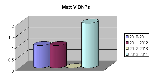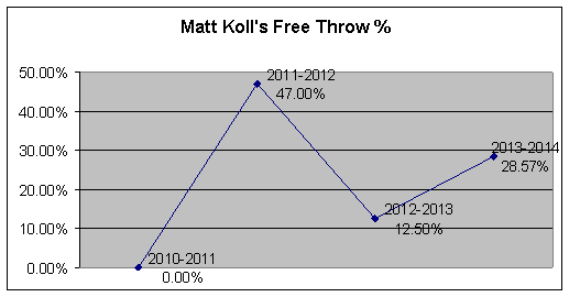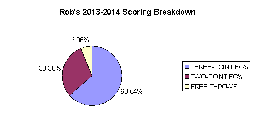 Matt Koll: Matt has had an interesting season. His team started strong, looked top-tier, fell into the toilet, recovered, and then slipped back into the poopy water. In contradiction to his team's inconsistent play, Matt has been very steady in 2013-2014. He's scoring at a higher clip than usual and his first half stats look strong, even though his averages were heavily decreased by an injury in his team's Week Eight loss. His rebounding is down, but that's understandable for a big team that plays such good defense and such bad offense: all the possessions are extended. It's a safe bet that any game Dark Blue plays results in 15-20 less shot attempts than other games, which means less rebounds to go around. What Dark Blue needs (and what Matt Koll needs) is a signature win/moment. They need something to hang their hat on that pushes them into championship contention. After six games, they sit at 3-3, but that record reflects an overtime loss to the worst team in HatchetBall and a golden opportunity to beat the best team in HatchetBall gone sour in Week Eight (largely due to Matt's injury). If those two games go differently, we'd regard Dark Blue, and Matt Koll, much differently. He's playing well and shooting well, but he's going to have to carry the scoring load for a team full of guys that seem to forget that the object of basketball is to score points.