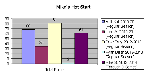 Mike Steigerwald: The effect Mike has had on Team Red has been damn near revolutionary. He took a team that was floundering at 1-2 and promptly led them to three wins in three weeks. His confident shooting appears to be contagious: all sorts of shots are falling for Team Red, from all sorts of players. Part of that is Mike drawing the defensive attention away from his teammates, but there is also an element of rejuvenation with this squad. They just seem to be having more fun out there when they're playing well; they believe every shot they throw up there will find its way through the net. There have to be some concerns about their lack of speed and they will need to form a contingency plan for when all those three-pointers aren't falling, but for now, they would be well-served to ride the fresh wave brought about by Mike's introduction into their lineup. Team Red's biggest challenges are still down the road (in Week Twelve and Week Sixteen), so if they're smart, they should be able to keep the good times rolling for many weeks to come.